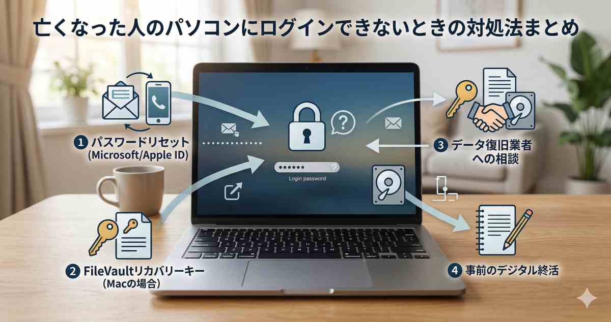 亡くなった人のパソコンにログインできないときの対処法を、優先順位順にまとめます。