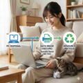 リビングで「パソコン無料処分」の箱にノートパソコンを詰める女性と、傍らで遊ぶ茶トラの子猫の様子。 【2】デバイスとデータ処理